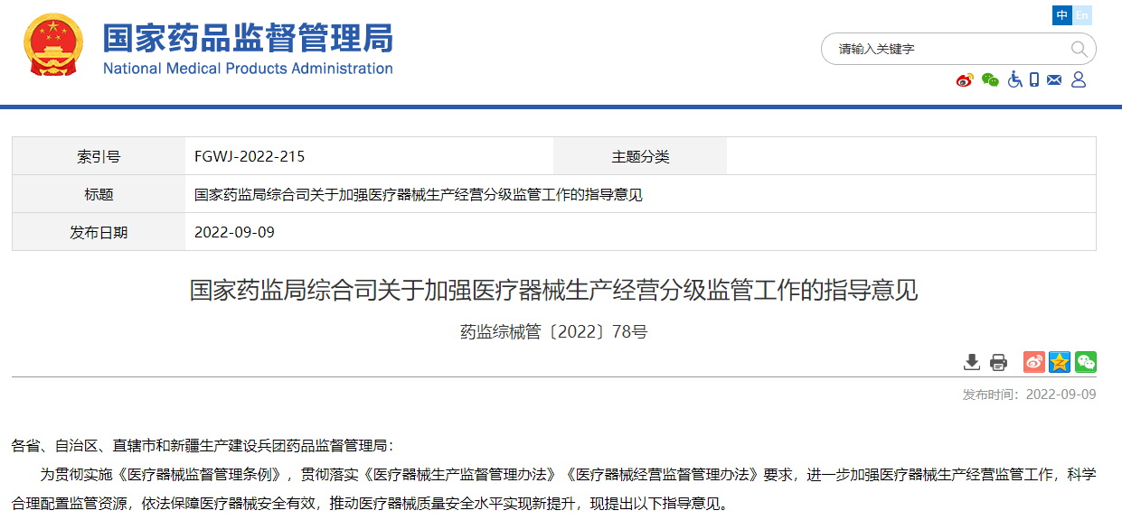 《國家藥監(jiān)局綜合司關(guān)于加強(qiáng)醫(yī)療器械生產(chǎn)經(jīng)營分級監(jiān)管工作的指導(dǎo)意見》,本指導(dǎo)意見自2023年1月1日起施行。原國家食品藥品監(jiān)督管理總局《關(guān)于印發(fā)〈醫(yī)療器械生產(chǎn)企業(yè)分類分級監(jiān)督管理規(guī)定〉的通知》(食藥監(jiān)械監(jiān)〔2014〕234號)、《關(guān)于印發(fā)國家重點(diǎn)監(jiān)管醫(yī)療器械目錄···