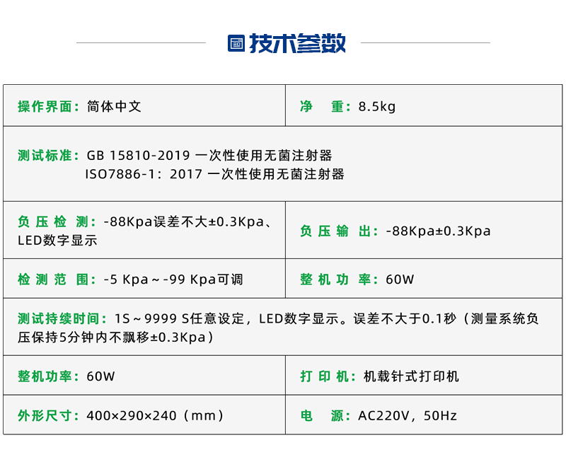 威夏科技 FY15810-T注射器密合性負(fù)壓測試儀主要用于測定用于注射器器身密合性檢測的物理特性,是鑒定醫(yī)用注射器器身密合性的重要手段之一。適用于輸液器、輸血器、輸液針、麻醉包、管路、導(dǎo)管、過濾器、快速接頭等。